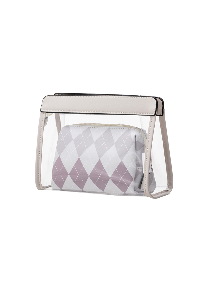 The transparent beauty case contains a second beauty case with a refined natural beige argyle pattern. Made from durable materials, these beauty cases offer a chic and functional solution for organizing your beauty essentials.
