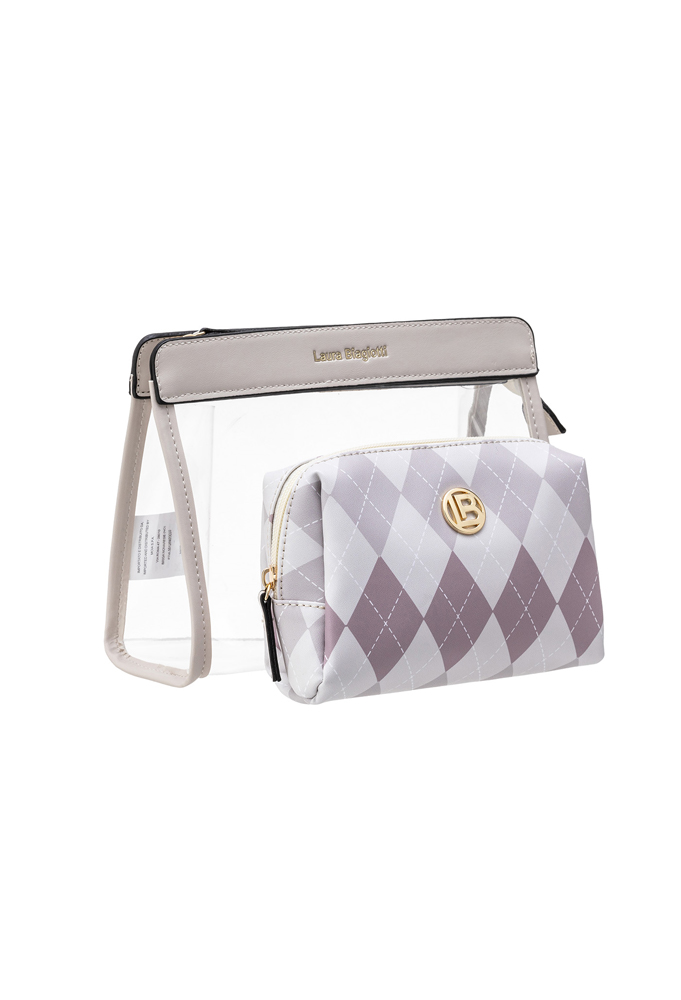 Two-Piece Set: Transparent beauty case with a second argyle pattern beauty case inside.
