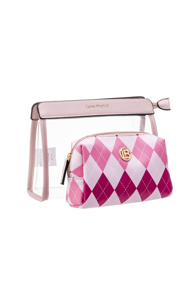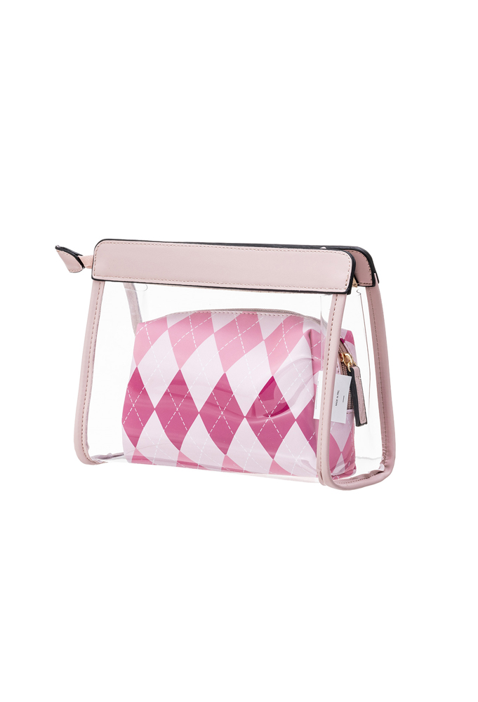 The transparent beauty case contains a second beauty case with a refined pink and powder argyle pattern. Made from durable materials, these beauty cases offer a chic and functional solution for organizing your beauty essentials.